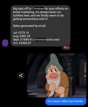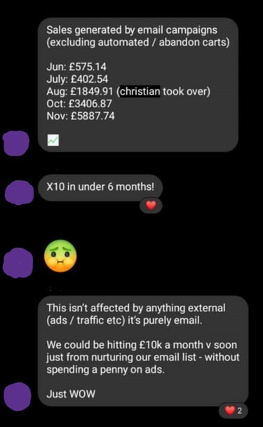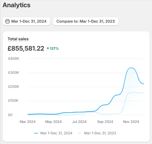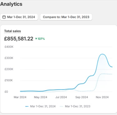 In just 10 months, I helped them scale from £360,740 to £855,581 by managing their Facebook ads, streamlining their design-to-listing process, and implementing effective email marketing strategies. By freeing the owners to focus on creating high-quality designs and scaling operations. We achieved a 137% revenue increase, 157% growth in orders, and a 140% rise in returning customers